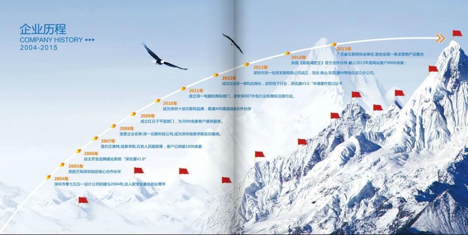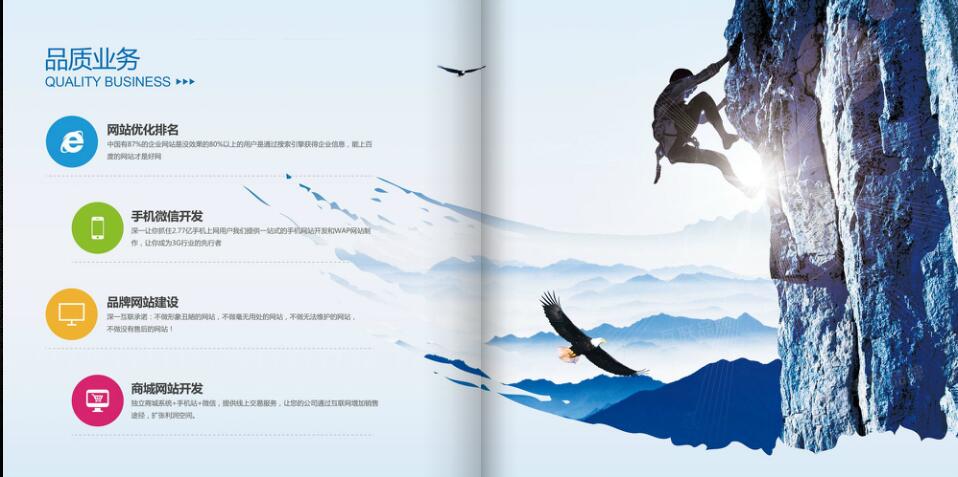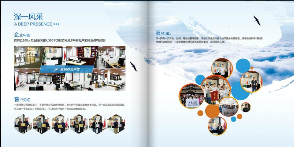 畫冊(cè)包含:企業(yè)介紹、發(fā)展歷程、核心業(yè)務(wù)、增值服務(wù)、經(jīng)典案例、知名客戶、售后服務(wù)等方面內(nèi)容,涵蓋了深一網(wǎng)站建設(shè)等一條龍營銷服務(wù)。